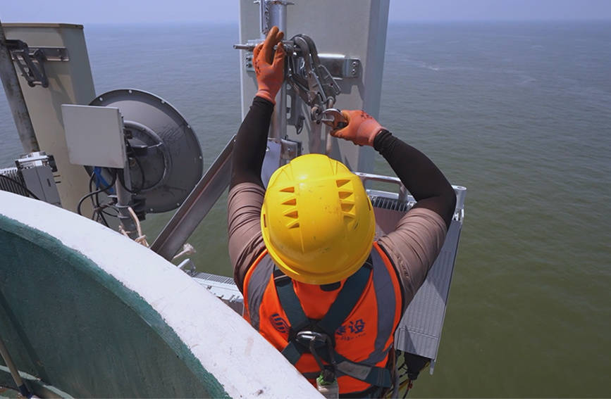 中国移动天津公司网络工程师正在海上维护5G-A基站。中国移动天津公司供图