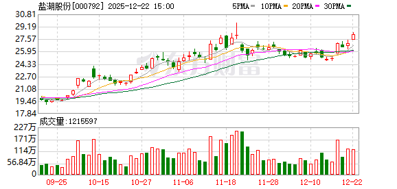 证券时报·数据宝统计显示,盐湖股份今日收盘价为28.17元,上涨4.22%,日换手率为2.30%,成交额为33.99亿元,全天主力资金净流入2.02亿元,近5日该股累计上涨13.00%,近5日资金合计净流入5.69亿元。