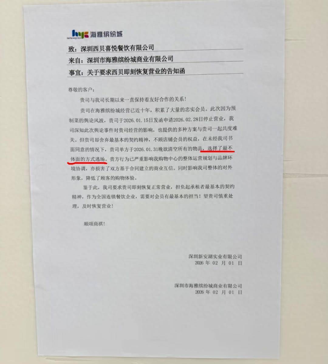 潇湘晨报·辣椒财经记者注意到,网友在社交媒体发布的照片显示,一份要求深圳西贝喜悦餐饮有限公司即刻恢复营业的告知函写道,其中提到,该公司在海雅缤纷城经营已近十年,该公司于2026年1月15日向商场发函申请2026年2月28日停止营业,但该公司却舍弃最基本的契约精神,不顾店铺会员的权益,在未经我司书面同意的情况下,贵司单方于2026年1月31日晚欲清空所有的物品,选择了最不体面的方式逃场。”该份告知函末尾,商场要求该公司即刻恢复正常营业,担负起承租者最基本的契约精神,作为全国连锁餐饮企业,需要对会员有最基本的担当。这份告知函的落款单位有两家公司,分别是深圳新安湖实业有限公司和深圳市海雅缤纷城商业有限公司,但落款没有盖两个公司的公章,告知函落款时间为2026年2月1日。