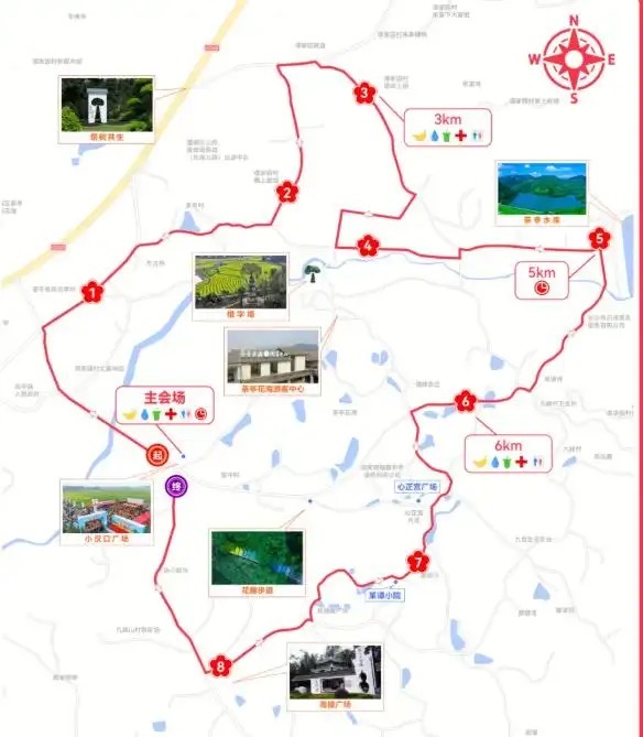 茶亭镇小汉口广场(起点)→茶杨线→茶亭小学→墈上屋小鱼儿→水库路→马家冲→花海主干道→篮球场→茶亭水库→窑冲湾→连心石头→心正宫→某谭小院→官塘坡→高陵广场→小汉口广场(终点)。