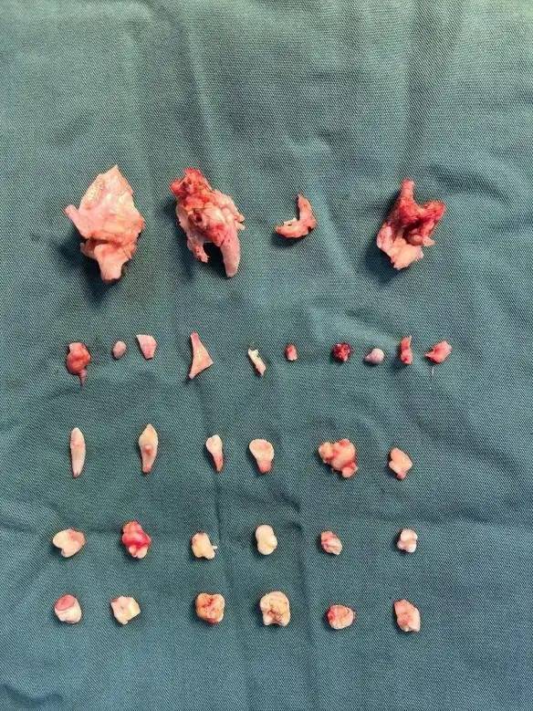 一听说要手术,年仅18岁的曾琳琳非常恐惧,她担心手术的疼痛,也害怕腹部会留下明显的疤痕影响美观。面对琳琳的担忧,魏馨和团队经过充分的术前评估与讨论,为她量身定制了“经脐单孔腹腔镜手术”的治疗方案。手术由魏馨主刀,凭借精湛的技术和丰富的经验,团队通过这唯一的肚脐切口,成功将直径12厘米的畸胎瘤完整无损地剥离并取出。术后清点肿瘤内容物时,连医护人员都感到惊讶:里面竟然包含了24颗形态各异的牙齿,以及最大直径接近5厘米的骨骼组织。