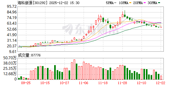 证券时报·数据宝统计,截至发稿,海科新源收盘价为56.20元,上涨1.08%,本期筹码集中以来股价累计下跌14.39%。具体到各交易日,2次上涨,6次下跌。