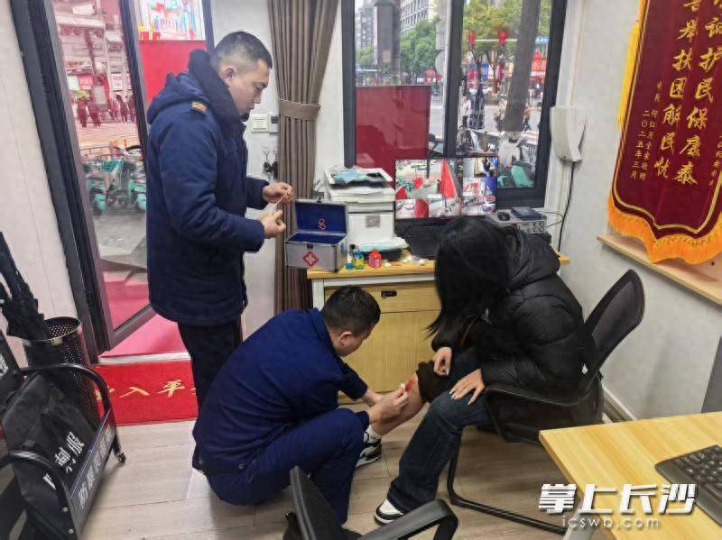 长沙晚报掌上长沙3月1日讯(全媒体记者 周小华 通讯员 余娜娜 苏伟)2月28日,一名受伤的女游客来到天心区五一商圈消防救援站一号执勤点求助,消防员反应迅速,为其进行专业的伤口处理。这是五一商圈消防救援站变身“安心驿站”、开展便民服务的暖心一幕。